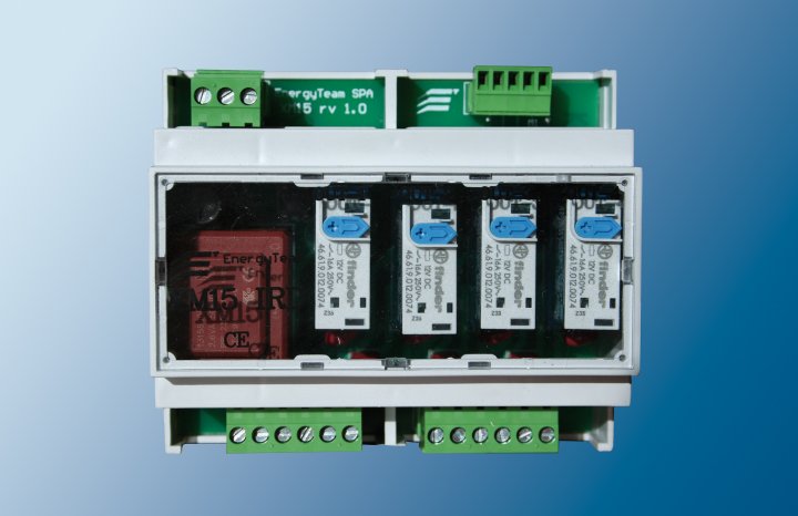 This module, powered by a single-phase line at 230Vac, provides 4 totally independent relays (one for each X-Meter’s output) each one it’s able to switch a load of 250Vac and current of 16A. For every relay all three contacts with single exchange (C, NC, NO) are available at the outlet (connector board) with two protection varistors (275V) against over-voltage at the contacts. In addition, each of the 4 relays of XM15 module is fitted with a LED to indicate how active it is (that is, when the corresponding outlet of the X-Meter is active) and a manual test button for the switching of the exchange.