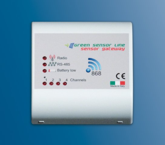 The receiving GSL-C module receives via radio the measurements carried out by a family of compatible transmitter sensors. The measurements received are then produced onto digital outputs. Each received size corresponds to a channel on the output. This module is able to process up to 4 channels. It also implements the warning signal when remote sensor’s battery is getting discharged, this occurs a few weeks before the complete discharge. It’s compatible with transmitter sensor GSL-IT-W.