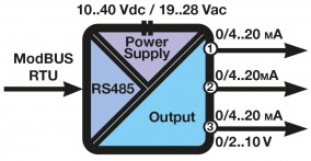 EZ-3AO is used to get N.3 analogue outputs (mA or V) from a ModBUS system. The standard can be either mA (0..20mA / 4..20mA) or V (-10..10 V, 0..10 V or 2..10 V). A 3-way galvanic isolation among Power supply // input // RS485 circuits assures the integrity of your datas.