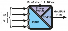 EZ-4AI is used to interface analog inputs (Voltage or current, also with bipolar range) with Modbus system. The modules is able to supply all 4 current loops at the same time, this is very useful for 2-wire sensors because the wiring does not need an external power supply. It’s a ModBUS Slave and can be coupled with any ModBUS Master device. A 3-way galvanic isolation among Power supply // input // RS485 circuits assures the integrity of your datas.