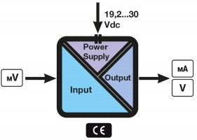 EK109LV allows a conversion of the signals with mV (±25 mV..±2000 mV) standard into mA/V standard signals. It’s useful for DC current monitoring through shunts. The power supply connection is available on the terminals or a special connector (K-BUS) allows a distribution of the power supply to the modules via bus connector. A 3-way galvanic isolation among Power supply // input // output circuits assures the integrity of your datas.