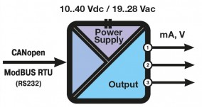 EZC-3AO is used to get N.3 analogue outputs (mA or V) from a CANopen system. The standard can be either mA (0..20mA / 4..20mA) or V (-10..10 V, 0..10 V or 2..10 V). A 3-way galvanic isolation among Power supply // input // RS485 circuits assures the integrity of your datas