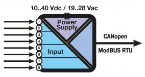 EZC-8AI is used to interface analog inputs (Voltage or current, also with bipolar range) with CANopen system. The modules is able to supply all 8 current loops at the same time, this is very useful for 2-wire sensors because the wiring does not need an external power supply. A 6-way galvanic isolation among Power supply // input (couples) // RS485 circuits assures the integrity of your datas.