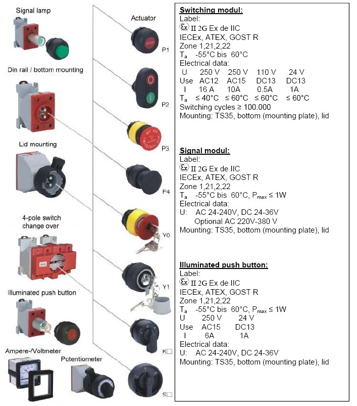 The standard diameter of the actuator of the local control units are designed Ø30mm and requires a wall thickness between 1mm-6mm. The components for bottom mounting are mounted on the DIN rail TS35 or may be secured by bolts / screws directly on a mounting plate . The components for lid assembly are mounted in the bore provided with an easy- to-use clamp. The electrical contact is made with screw terminals for cables up to 2.5 mm². For use in hazardous areas, the components must be mounted in an ex approved enclosure. The different types of buttons and switching elements , as well as all lighting elements can be combined. Here, the predetermined distance from each other and the maximum load of the case is to be observed. The signal elements ( indicators and illuminated pushbuttons) are available in 5 colors. Everything needed for mounting accessories, and various label plates, which are labeled on request, completes the entire product portfolio.