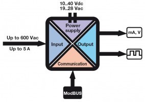 Model ES203TA-Dis a complete three-phase network analyzer,with display, suited for use with up to 600Vac voltage range, and max current equal to 5A connected to the inputs.The instrument provides all the following electrical measurable quantities: Vrms, Irms, Watt, VAR, VA, frequancy, Cosφ. All measurements given above (except frequency) are available both single-phase and three-phase. Measurements are read through serial communication both in floating point and normalized format (except Frequency and Active Energy).It is possible the analog retransmission of any Vrms, Irms, Watt and Cos quantity either single phase or three-phase, or any phase chosen (by specific display or MODBUSregistry)