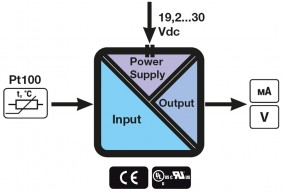 K109PT-HPC is an high performance converter for Thermoresistance PT100 with 2,3,4 wires and provides a mA/V standard output signal. The max admitted error is lower than K109PT because reported to a smaller range. It’s completely confi gurable through dip switches. A 3-way galvanic isolation among Power supply // input // output circuits assures the integrity of your datas.