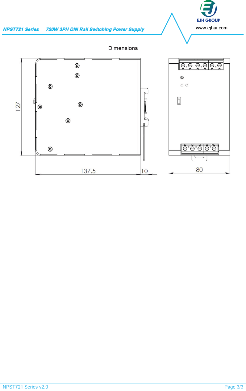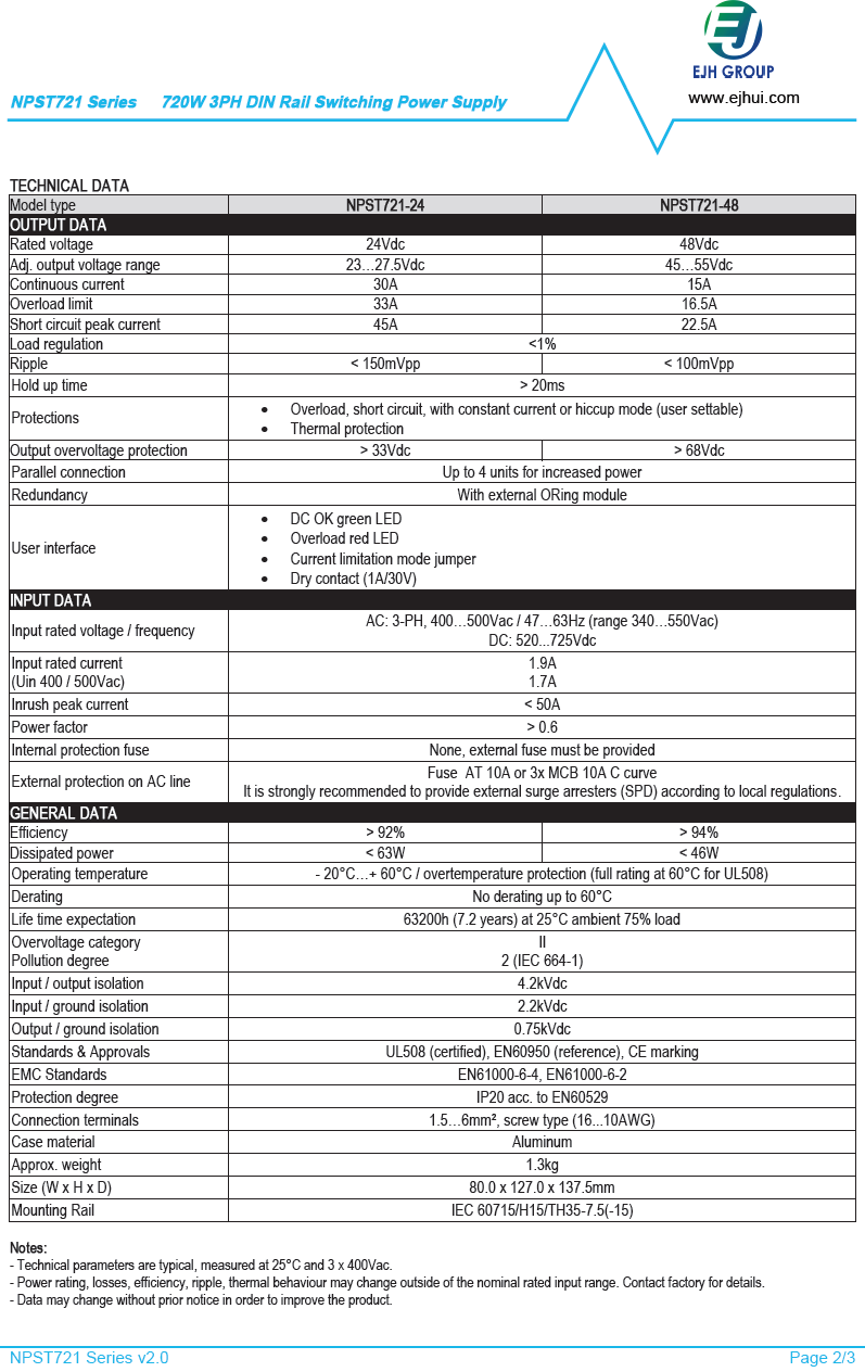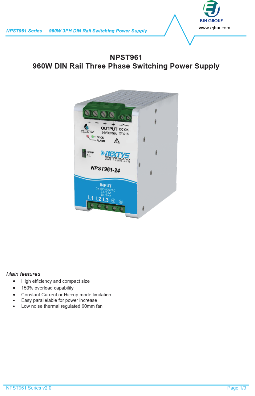 三相 480W 720W 960W 导轨电源constant current limitation 订购编号:NPST501 - NPST721 - NPST961
