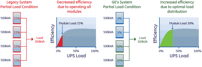 该系统中的一个UPS模块智能地承担领导角色, 而另一个UPS模块可访问所有控制参数。如果一个UPS无法运行,则会在其他UPS之间自动重新分配负载。如果主UPS无法运行,则另一个UPS会自动之 间自动承担领导角色。GE的RPA技术是通过将控制电子器件分布在该系统的每个UPS模块中加以实施的。