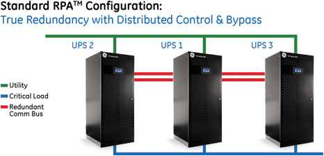 冗余并行架构™ (RPA)系统配置GE提供了RPA,这是一种能够通过消除任何单点故障来并联具有真正冗余的UPS模块的独特技术。RPA提供了一种可扩展的并联方法,该方法无需使用外部并联设备和机柜(集中式旁路和主控制),从而可减小占地面积并提高系统可靠性。该系统中的一个UPS模块智能地承担领导角色, 而另一个UPS模块可访问所有控制参数。如果一个UPS无法运行,则会在其他UPS之间自动重新分配负载。如果主UPS无法运行,则另一个UPS会自动之 间自动承担领导角色。GE的RPA技术是通过将控制电子器件分布在该系统的每个UPS模块中加以实施的。