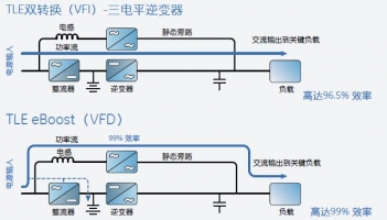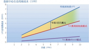 eBoost随着数据中心能源需求的不断增长,能耗是IT组织面临的一个关键问题。他们的目标是降低成本并使数据中心保持运行。IT组织能够利用GE的eBoost技术降低能耗成本并提高系统可靠性e = 高达99%的高效率Boost = 快速转变到逆变器< 2ms高效率 – 数据中心生命周期成本节约相比于运行效率为94%的传统无变压器UPS,在双转换模式下效率高达96.5%、在eBoost工作模式下效率高达99%的TLE系列可实现巨 大的生命周期成本节约。节约取决于负载、电力成本和生命周期持续时间(年)。对于6 MW负载,TLE系列在VFI模式下运行时可节约$2 MM。假设