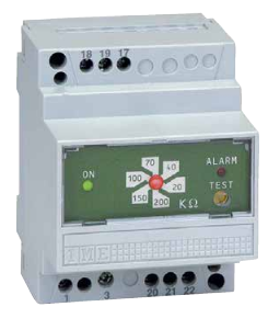 Insulation monitor for direct current network - Format: 4 DIN module - Input: 210…230 Vdc - Output: 1 relay with SPDT contact - Aux: 150 Vac - Alarm threshold: 20...200 kohm