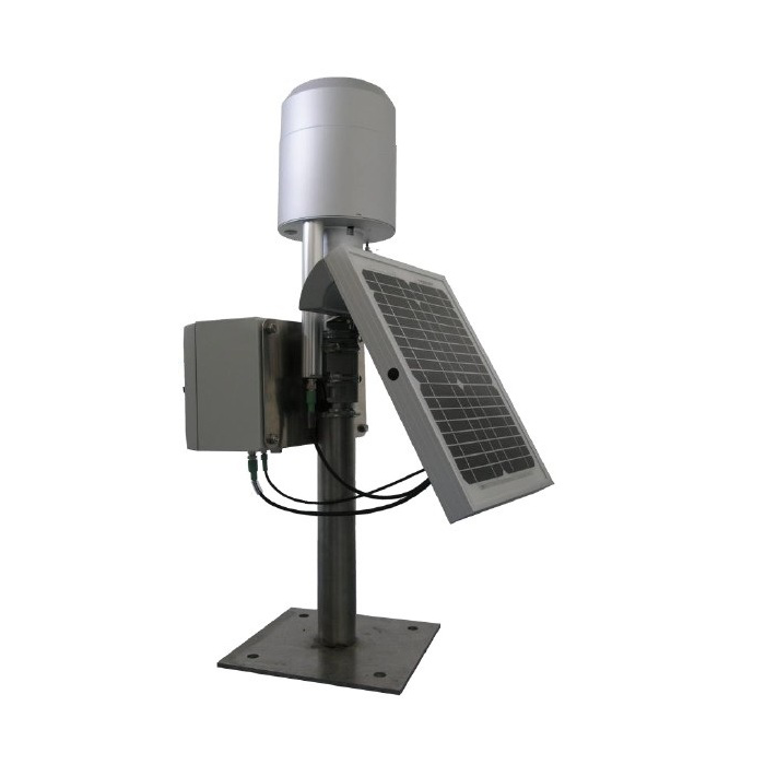 Stand alone, solar powered precipitation measuring station with the new data logger PreLOG. Data is sent via GPRS by the integrated modem.