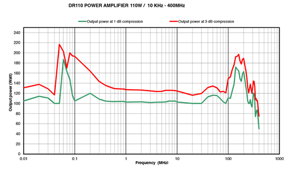 Power at 3 dB compression : 110 W min. up to 250 MHz / 70 W min. from 250 MHz to 400 MHz