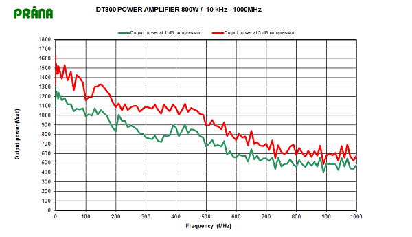 Power at 3 dB compression : 900 W min. up to 200 MHz / 450 W min. from 200 MHz to 1000 MHz