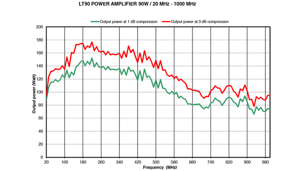 Power at 3 dB compression : 65 W min up to 80 MHz/ 90 W min from 80 to 500 MHz/ 60 W min from 500 to 1000 MHz