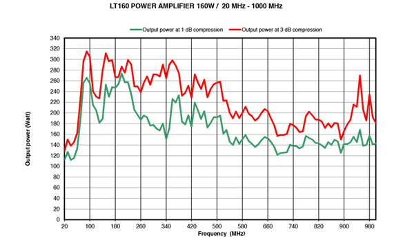 Power at 1 dB compression : 80W min up to 80 MHz/ 140W min from 80 to 500 MHz/ 100W min from 500 to 1000 MHz