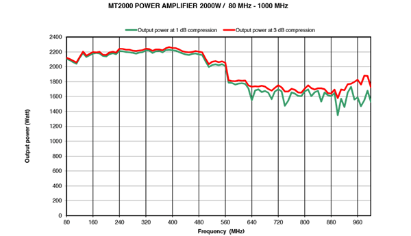 Power at 3 dB compression : 2000 W min up to 500 MHz /1400 W min from 500 MHz to 1000 MHz