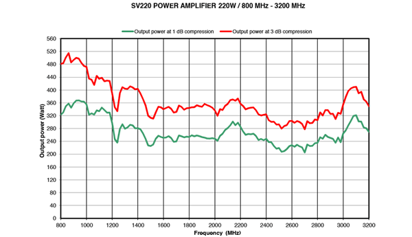Power at 3 dB compression : 200 W min. up to 2 GHz / 180 W min. from 2 GHz to 3.2 GHz