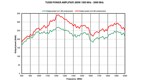 Power at 3 dB compression : 140 W min. up to 1 GHz / 200 W min. from 1 GHz to 2 GHz *