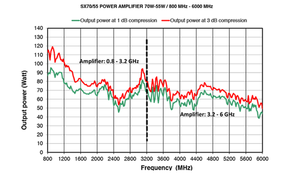 Power at 3 dB compression : 48 W min. up to 3.2 GHz / 42 W min. up to 6 GHz *