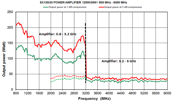Power at 3 dB compression : 100 W min. up to 3.2 GHz / 25 W min. up to 6 GHz *