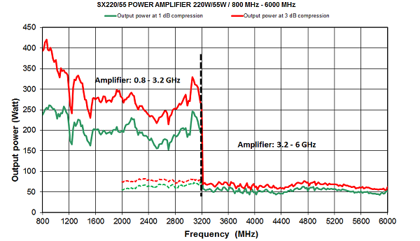 Power at 3 dB compression : 190 W min. up to 3.2 GHz / 45 W min. up to 6 GHz *