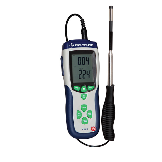 The Digi-Sense hot-wire thermoanemometer is designed for precision air velocity and airflow measurements in seven user-selectable units (ft/min, m/s, mph, km/h, knots, CFM, or CMM). The instrument will help you meet cooling and environmental requirements for safety and comfort. The large dual display allows you to simultaneously read air velocity or airflow and air temperature and shows real time, maximum, minimum, and average values for the parameters under investigation. Slim telescopic probe is designed to reach into small openings.