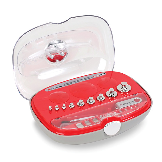 Supplied in a high quality polycarbonate case with a compartment for each weight as well as compartments for a brush, forceps and USB flash drive. |