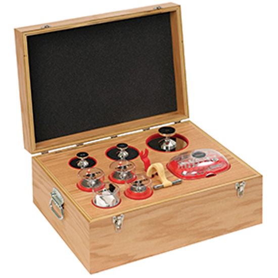 Lifting forceps or gloves to handle each weight in the set. Weights sets of 500 g and lower include a clear-top polycarbonate case. Weight sets where the largest weight is 1kg and above are supplied in a felt line oak case. All weights include noted documentation of accuracy from the vendor.