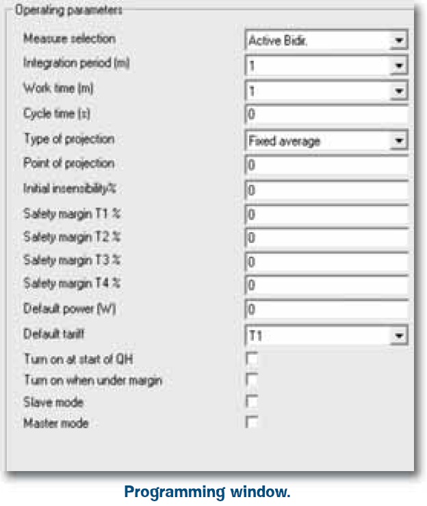 If the loads are more than 4, it’s possible using further instruments connected among them. All these instruments, such as the first one, measure the power on the delivery point and front time to time they are enabled for cutting off further loads, when the interruption of the previous loads hasn’t been enough to avoid the overcoming of power. You can select the integration time from 1 to 60 minutes (default is 15’) and the management of the loads will be carried out always according to the average value calculated on the selected time of integration. The average value may be steady or floating, it depends by the meter: if it sends or not the synchronous signal in the zone. |