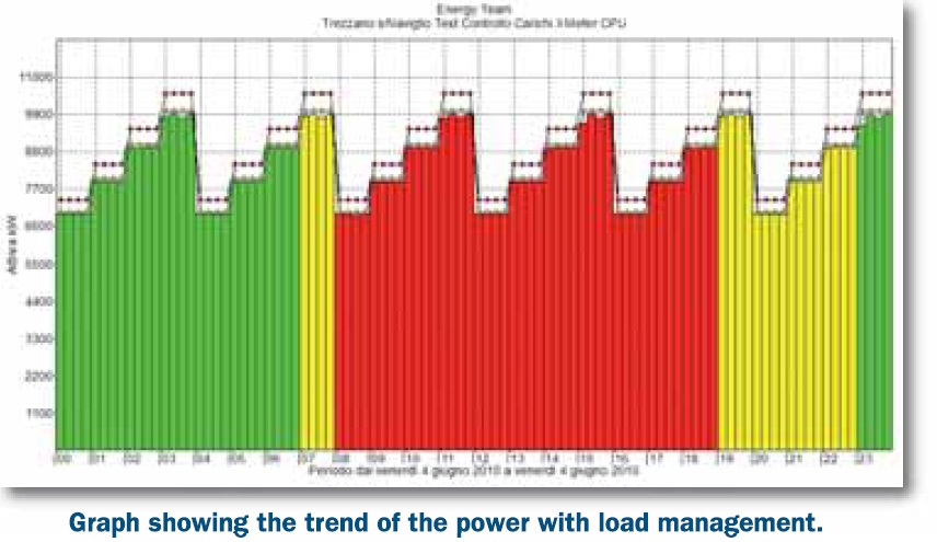 Load management is carried out using the “method of forecasting”. The interruption is driven when the expectation about total of consumption in the integration time, obtained by projecting the actual absorption-curve to the end of the time, goes over the set limit. The particular algorithm allows you to use at maximum the available energy within integration time, penalizing at the minimum the enabled loads which may be cut off. The load interruption is carried out as late as possible, considering also the quantity of energy that may be recovered by cutting it off, based also on the “weight” of the load. The advantage of this methodology is to avoid troublesome releases and reboots of the load in short times, which might occur if the hysteresis of each load isn’t considered. In order to avoid dangerous peaks in energy absorption, due to simultaneous restart of more loads, the systems foresees a method for inserting gradually the loads. The systems also allows you to check the loads which ask particular conditions of the plant for being released of restarted. For these loads, the action of the device may be inhibited if digital inputs don’t allow it (it’s essential for managing the consumers whose working depends by determined working phases). |