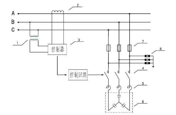 控制器根据采集到电网的实时数据进行判断,当控制器检测到系统无功功率低于设定值时,控制器发出合闸控制指令给真空接触器,将投入电容器组,当无功功率高于设定值时,控制器发出切除指令给真空接触器,将电容器切除,达到自动补偿的目的。