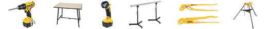 Swedish pattern wrenches 'S', water pump pliers, cordless power drill, folding work bench, material supports, battery LED lamp, hand pressure testing pump, electric pressure testing pump, electric filling and flushing units