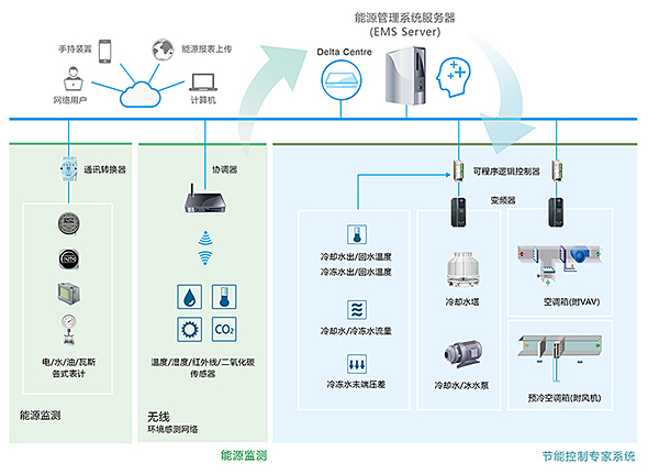 因应大数据来临,支持全球化能源管理架构的台达能源在线监控系统(Delta Energy Online),可不受实物限制地进行全球化、跨地域及跨建筑物的能耗数据管理,将复杂庞大的原始数据转换为有价值的分析讯息,统整为建筑物-地区-全球 观点,并可通过各种实体及虚拟I/O计算工具,搭配自动节能指标计算器,协助用户快速进行数据点的组合与运算,进而了解各种管理角度的节能潜力点;通过专 家系统及可自定义的规则化控制,量身打造该企业节能策略。